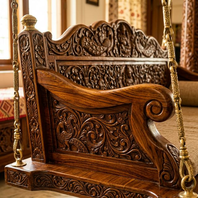 Teak's beautiful golden-brown appearance simply cannot be replicated. It holds heavy carvings intricately without splintering, making it the perfect canvas for Rajasthani or Gujarati royal jhula designs.